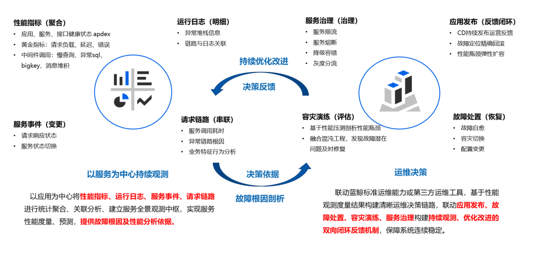 联动标准运维能力及AI赋能加持,基于性能观测度量结果构建清晰运维决策链路,联动应用发布、故障处置、容灾演练、服务治理,构建持续观测、优化改进的双向闭环反馈机制,保障系统连续稳定。