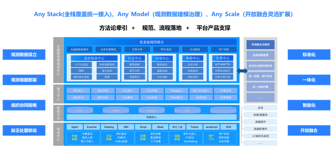 云原生时代的观测技术,由单一时序指标数据向指标、链路、明细多维数据关联联动过渡,由单一监控工具向分布式链路追踪、海量日志检索、集中告警治理、工程化AI的可观测体系平台演进。主要包含四个方面:
