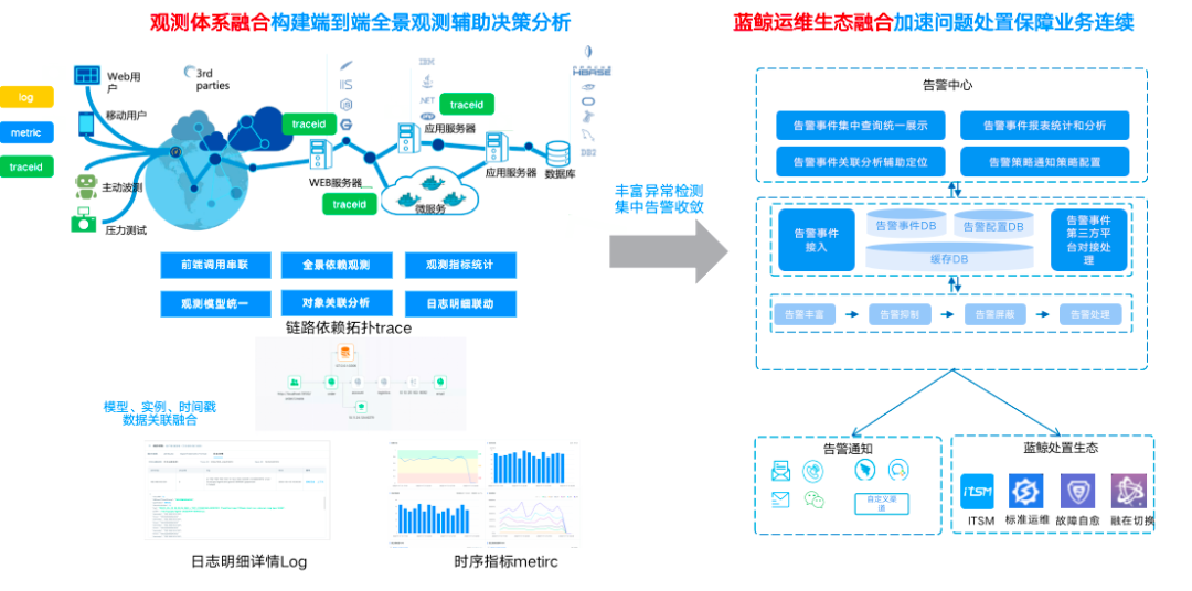 嘉为鲸眼可观测产品是一款面向企业IT研发、运维、业务提供的一款领先的端到端体系化全链条可观测产品,覆盖用户侧真实体验分析、后端应用性能分析、指标体系建设、明细日志检索、海量事件告警的全栈观测场景,解决用户体验度量、业务故障感知、清晰故障定位、精准故障告警、高效数据检索等核心问题,全方位满足客户及时性、准确性、辅助故障处置决策的可观测需求。