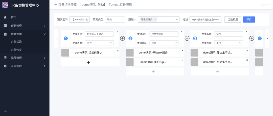随着企业IT规模的不断扩大,IT架构设计不断演变,导致灾备切换的场景变得越来越复杂。灾备切换软件需能够满足复杂场景的流程配置。
