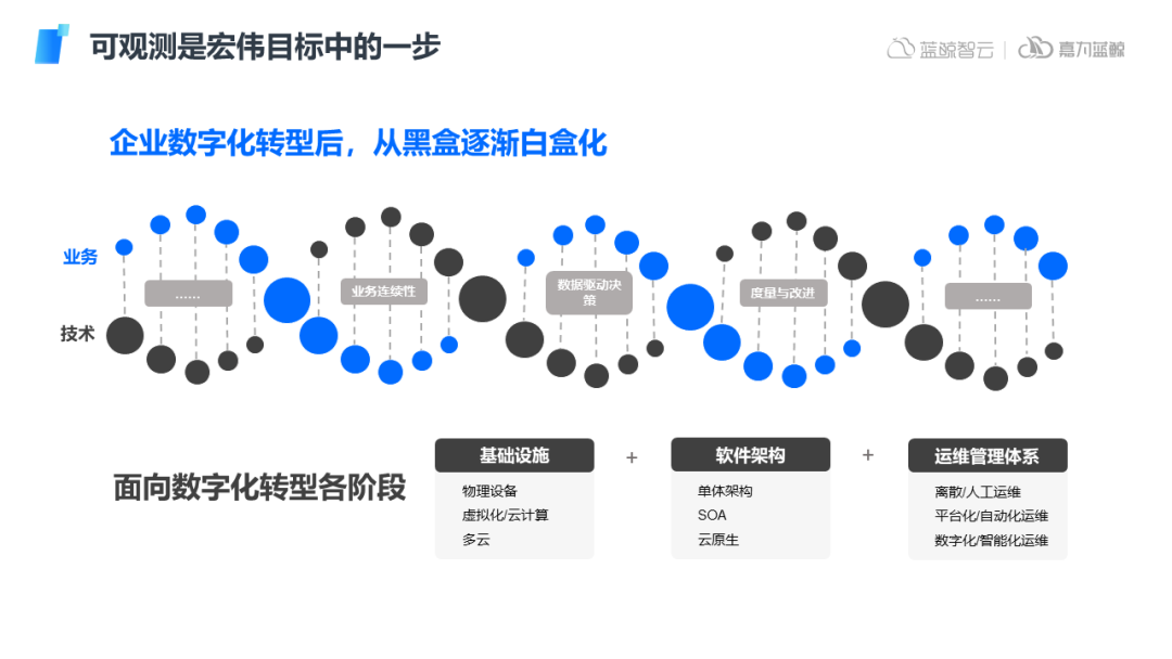 数字化转型是一个长期过程,早期企业IT运维主要还是面向物理设备,而随着技术架构的不断发展,运维对象逐渐向虚拟化、云化趋势发展,软件架构逐渐向SOA、云原生等架构转变。业务的线上化趋势下,传统IT运维往往无法及时感知和处理问题,企业运维处于黑盒化状态,在此背景下,运维管理体系需要向自动化、智能化转型,以服务于快速发展的企业业务。