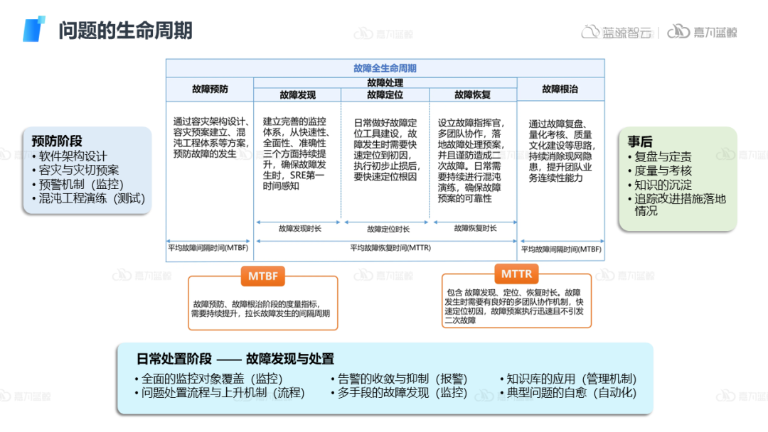 在日常处置问题的阶段,运维人员主要关注两个核心指标:MTBF,MTTR。