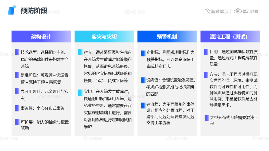 预防阶段主要关注以下几个方面,来降低故障发生的频率,做好预防阶段的规划也是提高SLA的最根本的手段,通常这类规划不会单独由运维来执行,而是需要整体团队协同配合,共同达成的目标。