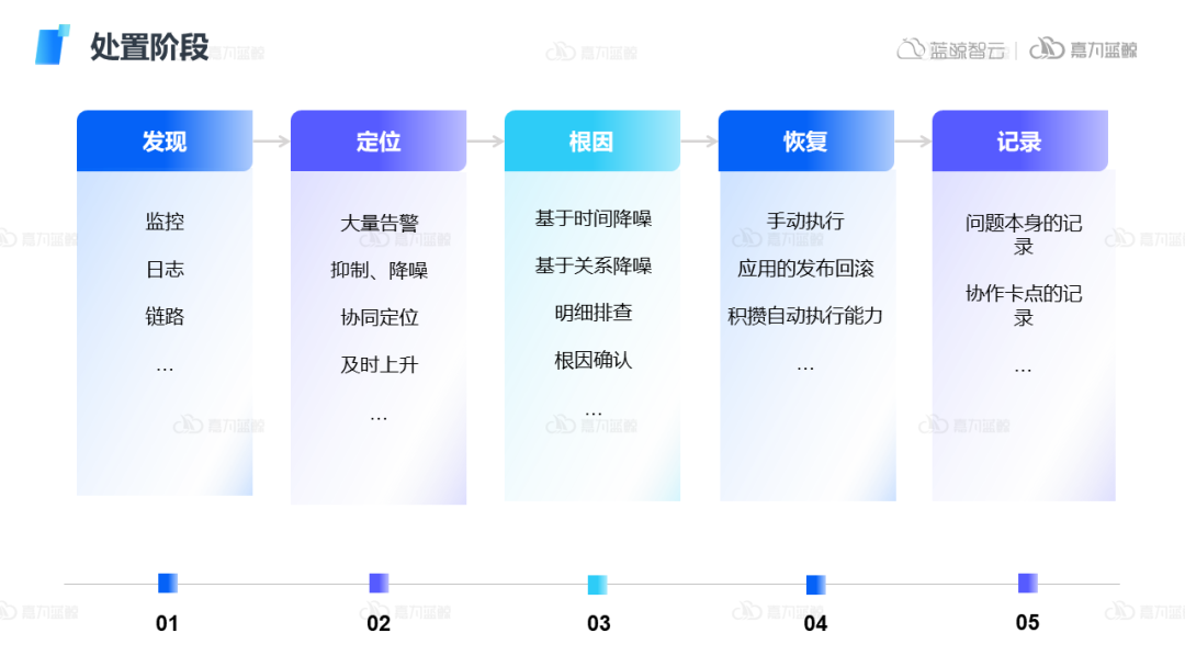 4)恢复:恢复阶段除了手动的操作以外,类似应用发布场景下,可以将发布操作,发布回滚等一些可复用场景进行自动化能力的积攒,以提高故障恢复效率。