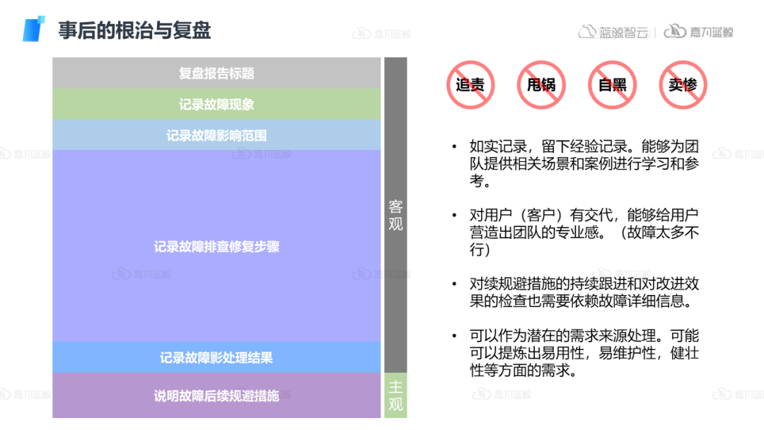 故障的根治并不代表能够彻底消除故障,而是通过事后的复盘和一些处理手段的总结,能够尽量减少同类故障的发生,同时在过程中通过对人员的管理和考核手段,做好良好的文化建设,避免“追责”、“甩锅”、“自黑”、“卖惨”等不良文化,进行团队可持续性优化和改进。