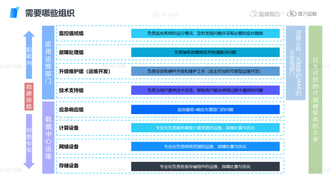 向下:数据中心运维。更多组建的是对象专家团队,分别对各类资源去设计组织,确保团队的专业性,针对相应问题能够有效提供解决方法。