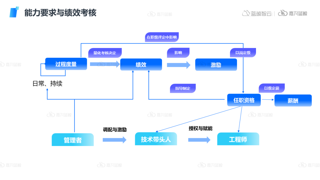同时整个过程的度量可以用于人员的职级评定的重要指标依据,管理者需要做好资源的调配与激励规划,同时在组织中要推动技术带头人不断赋能工程师,团队内部互相扶持进步,实现整体团队的前进,从而形成良好的组织管理闭环。