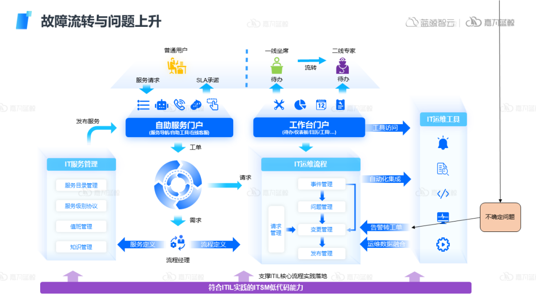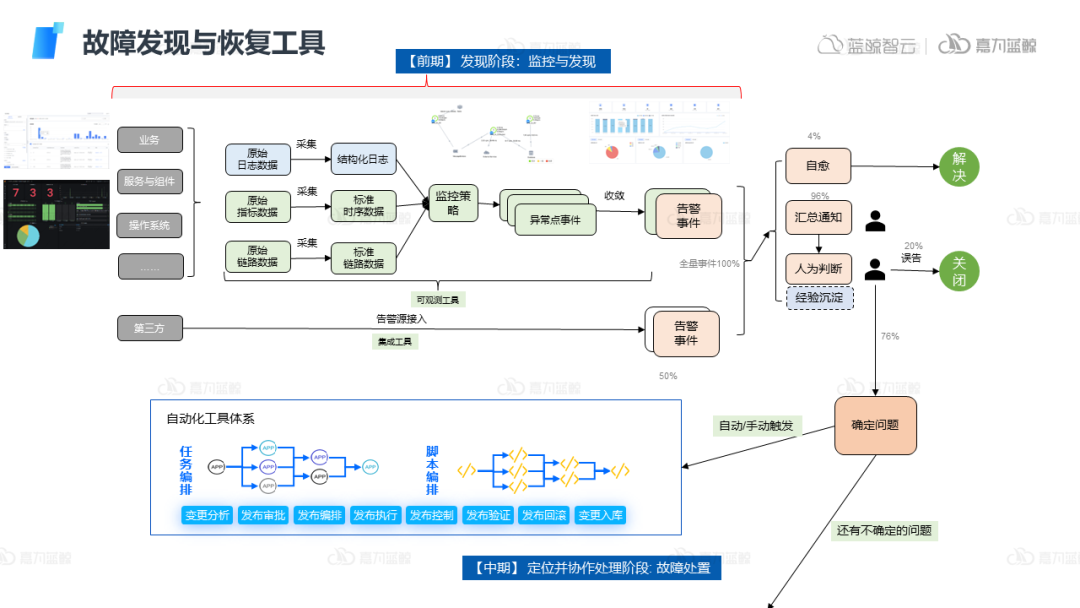 对于一些不确定的、无法解决的复杂的问题,难以在IT组织内完成闭环的,可以通过流程体系的建设,做好故障的流转与问题的上升。可观测工具、自动化工具与流程体系的相互融合以达到故障的全生命周期管理。