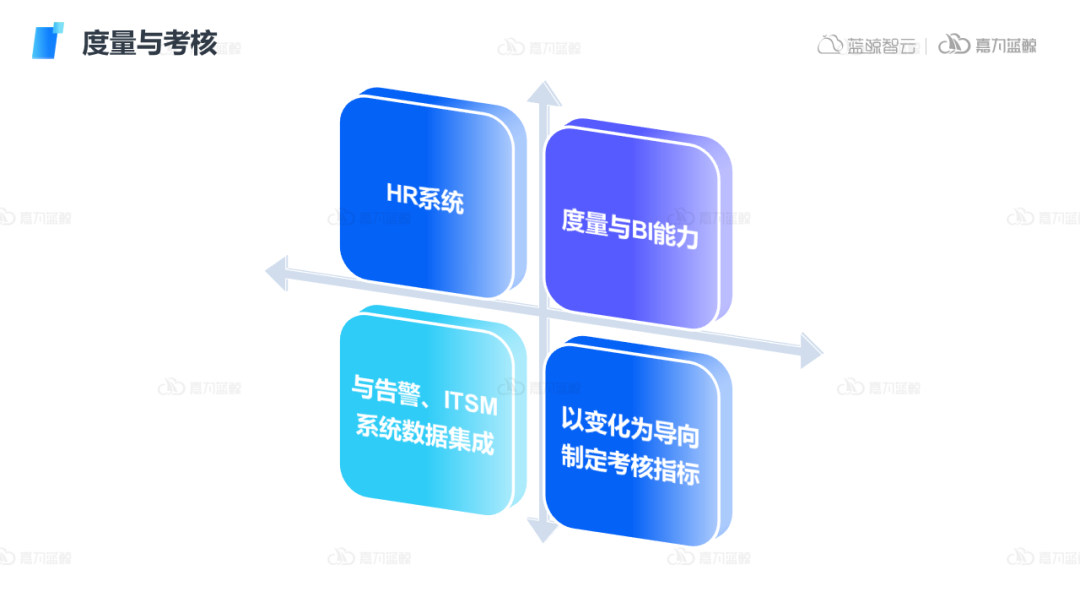 最后是结合上文对组织度量和考核的建设,对涉及到的HR系统、度量与BI能力、ITSM等进行相应的配套优化,以度量数据为基础,以变化为导向制定考核指标,从而实现有效的组织管理。