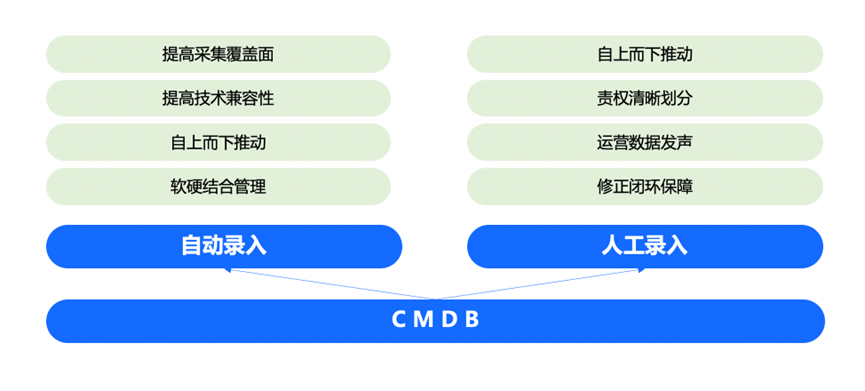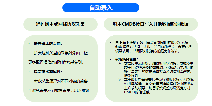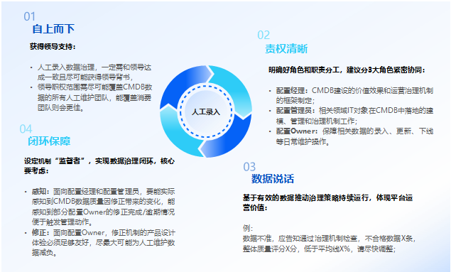 自上而下:指对于人工录入数据的治理办法,一定需要和领导达成一致并且尽可能在会议上获得领导背书,这个领导的职权范围需尽可能覆盖CMDB数据的所有人工维护团队,能覆盖消费团队则会更佳。