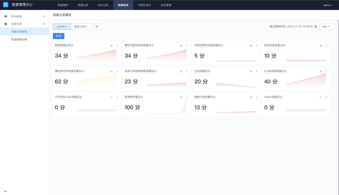 功能介绍:为配置经理/配置管理员提供CMDB全局/模型/科室(子公司)/个人等不同维度的数据质量评分及评分趋势。