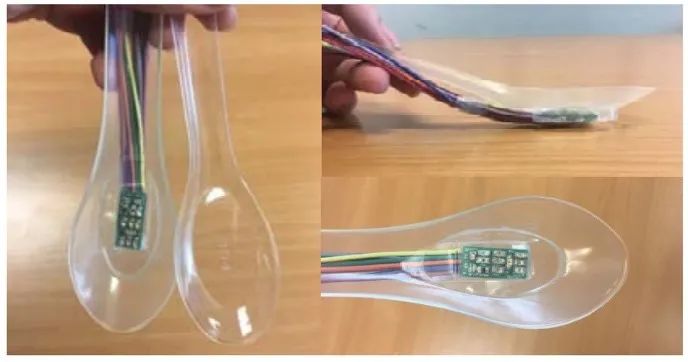 除此之外,我们开发了一系列智能餐具辅佐判断食物营养。由于不同光谱对食物营养成分的反射率各不相同,智能餐具可以利用光谱的反射原理,判断餐具中的食物类型。我们设计了一款有12个LED灯的智能勺子(见图6),它可以监测勺子上方是否放置了食物以及放置的食物类型。利用机器学习模型,能够以非常高的准确度(>95%)对20多种食物进行分类。在此基础上,我们探索了光谱重建技术,并通过恢复智能餐具采集到的光谱进一步分析食物的脂肪、水分、蛋白质等具体营养成分。特别地,我们关注婴幼儿的营养管理,设计了一款能够监测婴儿辅食营养浓度的智能餐具(见图7)。该系统利用一个全光谱的光源(白炽灯)和一组光电二极管组建了一个具有成本效益的光谱仪。该光谱仪通过扫描食物获得一个低维的光谱,并将其输入到系统中进行光谱重建处理,重建得到的高维光谱经机器学习算法进一步分析得到所测婴儿食物的蛋白质、脂肪、碳水化合物三种宏量营养元素的浓度。该系统对婴儿食品宏量营养元素的预测性能可以与商业光谱仪媲美,但系统的造价不到10美元,是商用光谱仪的百分之一。