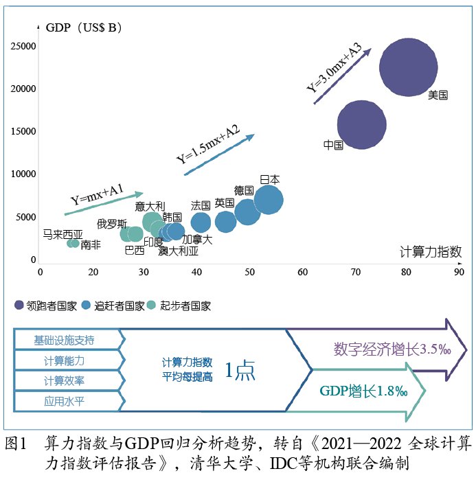算力正在成为改变经济增长模式的一种重要方式,算力的规模也正在成为衡量一个国家经济增长幅度的一个重要指标。根据清华大学与互联网数据中心(IDC)共同编制的《2021—2022全球计算力指数评估报告》(见图1),算力和经济增长具有很强的正相关性。算力指数每增长1个点,就可以带来约1.8‰的GDP增长和3.5‰的数字经济增长。截至目前,算力指数最高的是国家美国,第二是中国,随后依次是日本、德国、英国、法国等。