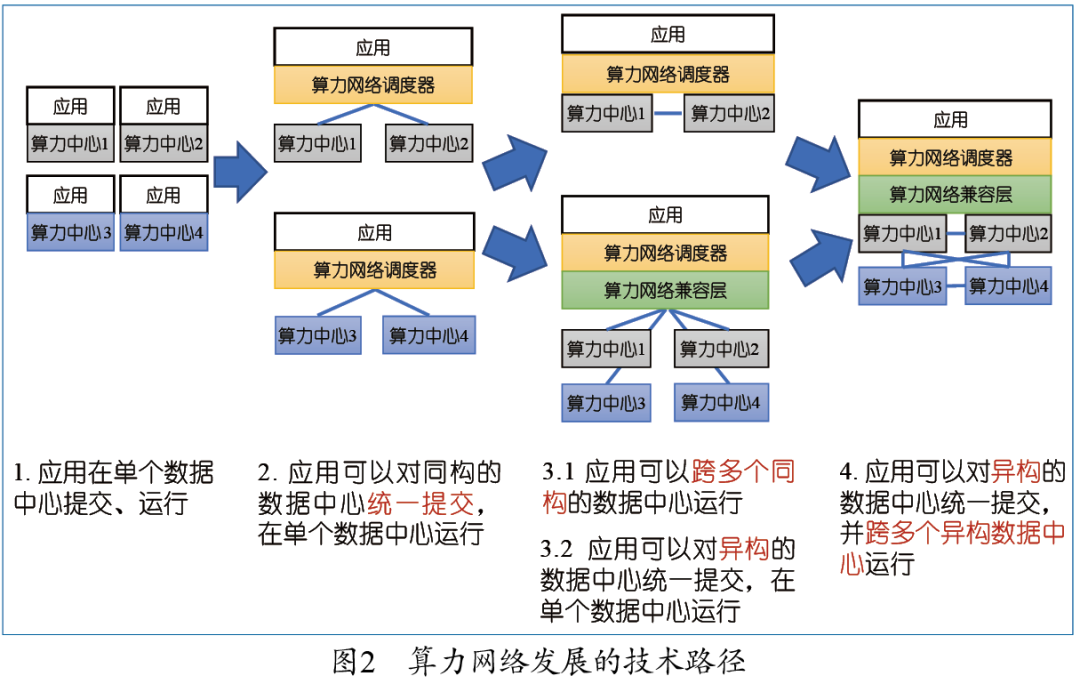 发展一个算力网络需要4个技术步骤(见图2):第一步是应用在单个数据中心提交任务、数据并运行;第二步是对同构的数据而言,应用可以在同构的环境但不同的数据中心进行提交,算力调度器统一调度资源,应用还在单个数据中心运行;第三步是应用可以跨多个同构的数据中心运行,也可以跨异构的数据中心统一提交,但最终还是在单个数据中心运行;第四步与电网类似,完全面向算力的用户,用户只需要提交应用需求,然后算力网络从网络进行资源调度,通过网络的兼容层把不同异构的算力整合起来统一使用。这时一个应用可以跨多个异构的数据中心同时运行得到结果。