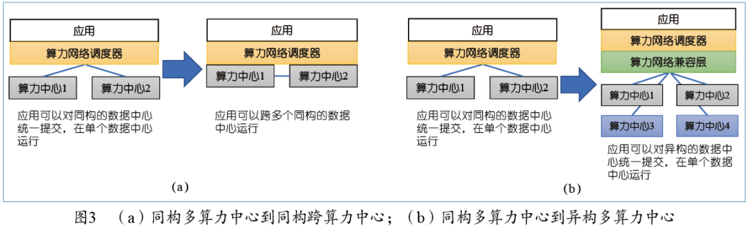 第二步到第三步跨越的另一个阶段是同构多算力中心向异构多算力中心跨越。在同构多算力中心上采用的CPU、算力资源等都是一样的,因此其上的封装以及调度较为容易。而在异构多算力中心上,其封装和调度的适配难度大大增加。由于其使用的是不同的算力资源,因此需要对异构的数据和资源提出更好的适配手段。