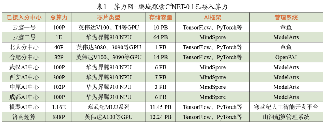 在国家发改委的部署与支持下,鹏城实验室于2019年启动中国智算网建设预研项目,研发了兼容多种异构AI芯片的核心软件栈与分布式调度平台,建设经费达3.5亿元。2022年6月完成验收。集合的算力总量为超过2.3E半浮点精度的运算能力,算力资源包括华为的NPU、寒武纪的MLU、英伟达的GPU等(见表1)。
