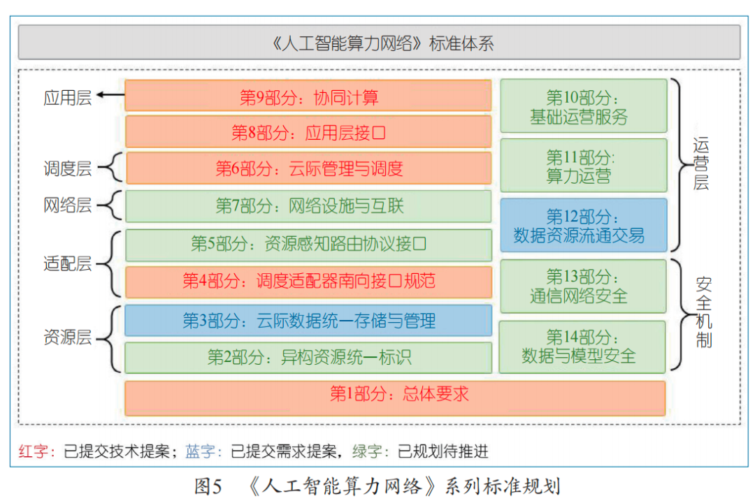 2021年12月,人工智能产业技术创新战略联盟(AITISA)正式成立智算中心和智算网络专题组,统筹推进智算中心和智算网络的标准化研制工作。鹏城实验室联合多家单位在智算专题组提出了《人工智能算力网络》系列标准规划(见图5),截至目前共提交了5份技术提案,7份需求提案。将不同的异构的智能算力分为不同层次进行标准化,方便封装、数据定义和资源的统一调配。