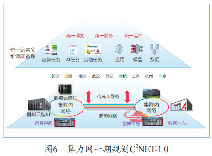 中国算力网一期规划(C2NET-1.0)的时间是从2022年7月至2025年12月,项目得到了国家科技部的支持,现在正在推进和实施,其总体建设目标包括三项内容(见图6)。第一,算力汇聚,构建不同节点的高速网络互联,研制云平台,实现算力的统一运维管理与弹性分配,为大模型提供可以跨节点分布学习的超级算力网络。第二,资源汇聚,集合最全的公共数据资源,实现不同节点间公共数据、模型等资源的安全开放、拉通共享、可信流动。第三,自生态汇聚,构建最强的生态聚合平台,实现不同节点间模型能力统一开放,共享不同节点间的应用创新成果,运营以智算网络为底座的开源社区。