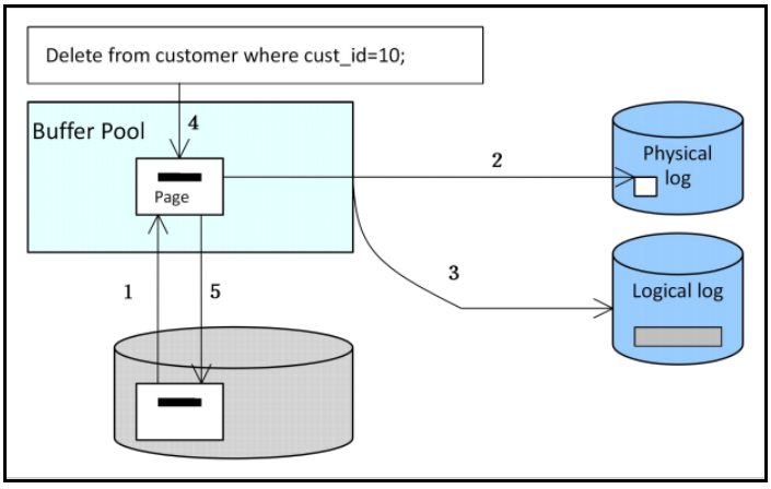 下图为事务Transaction的完整过程解析,这里假设事务 T1 需要删除1行记录:Delete from customer where cust_id=10;我们在前面讲解了存储结构的 Page 概念,Page是 I/O 的最小单位,在一个 Page 中存储多行记录,所以即使这里我们只删除了某一行记录,磁盘读写都需要操作一个 Page。其中磁盘的一个 Page 对应内存的一个内存页,这里删除一行记录,物理日志也需要将该 Page 的前影存储到物理日志中,同时需要记录逻辑日志信息。