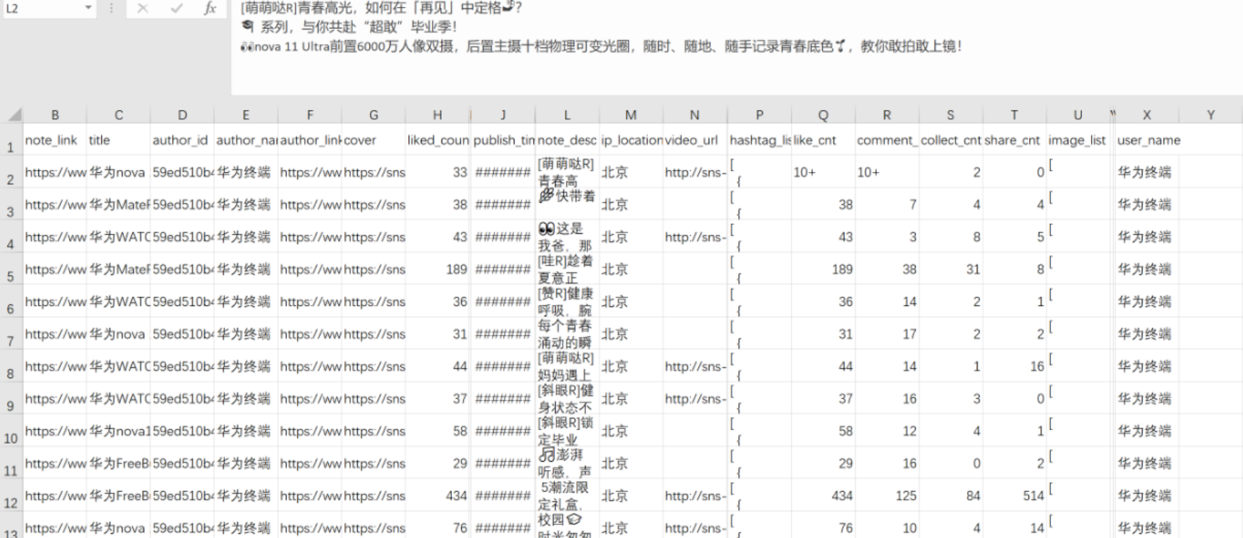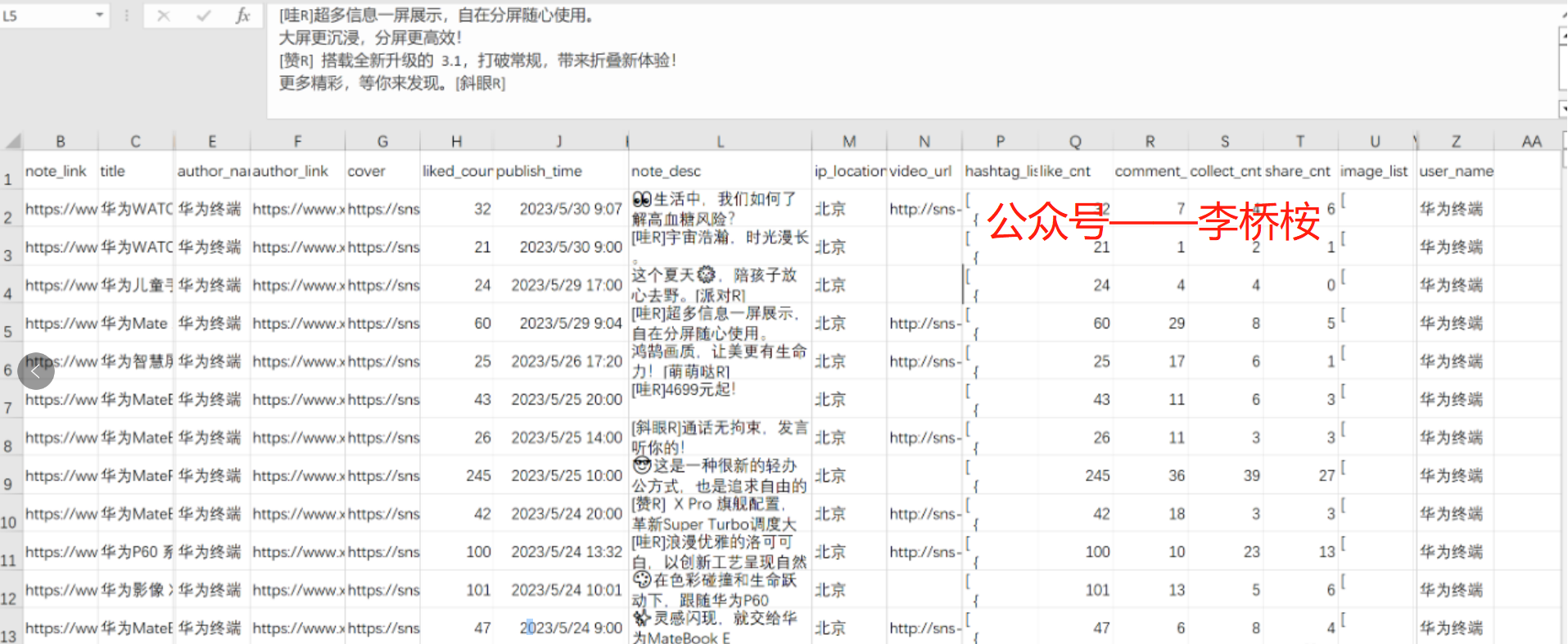 首先是「华为终端」发布过的笔记,导出到 csv 一共 1300 余条。