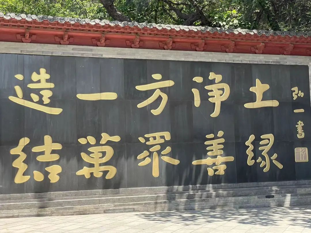 红螺寺门口有弘一大师亲笔手书的金字:“造一方净土,结万众善缘"。据说弘一法师的师父、民国四大高僧之一的印光大师曾在红螺寺短暂修行,晚年在普陀山法雨寺研究佛经长达十余年,著述甚丰,后被尊为净土宗第十三祖。世有“南普陀,北红螺”之说,可见红螺山在北方佛教中的地位。
