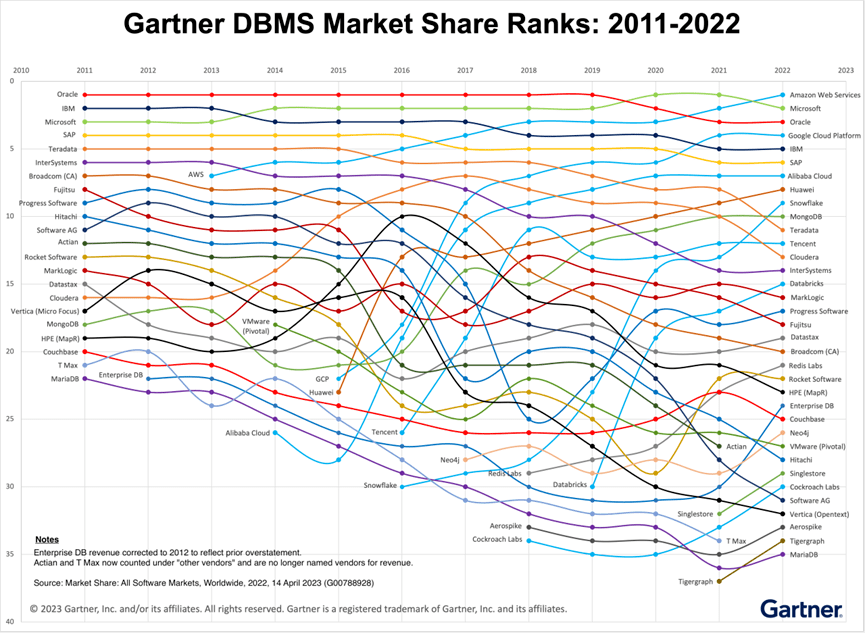 亚马逊云科技、微软、Oracle这三巨头近几年一直排名前三,占据了全球DBMS超过三分之二的份额,Oracle 2019年以前都是第一,随后被微软和亚马逊云科技相继超越。Google增长迅猛,但是市场份额(8.4%)想赶上前三还有很长的路要走。国内厂商中阿里云排名最高(第七位),但是增长曲线似乎有点儿放缓。华为云是一年一个台阶,稳步上升,现在排名第八,但是后面的追兵Snowflake来势汹汹。
