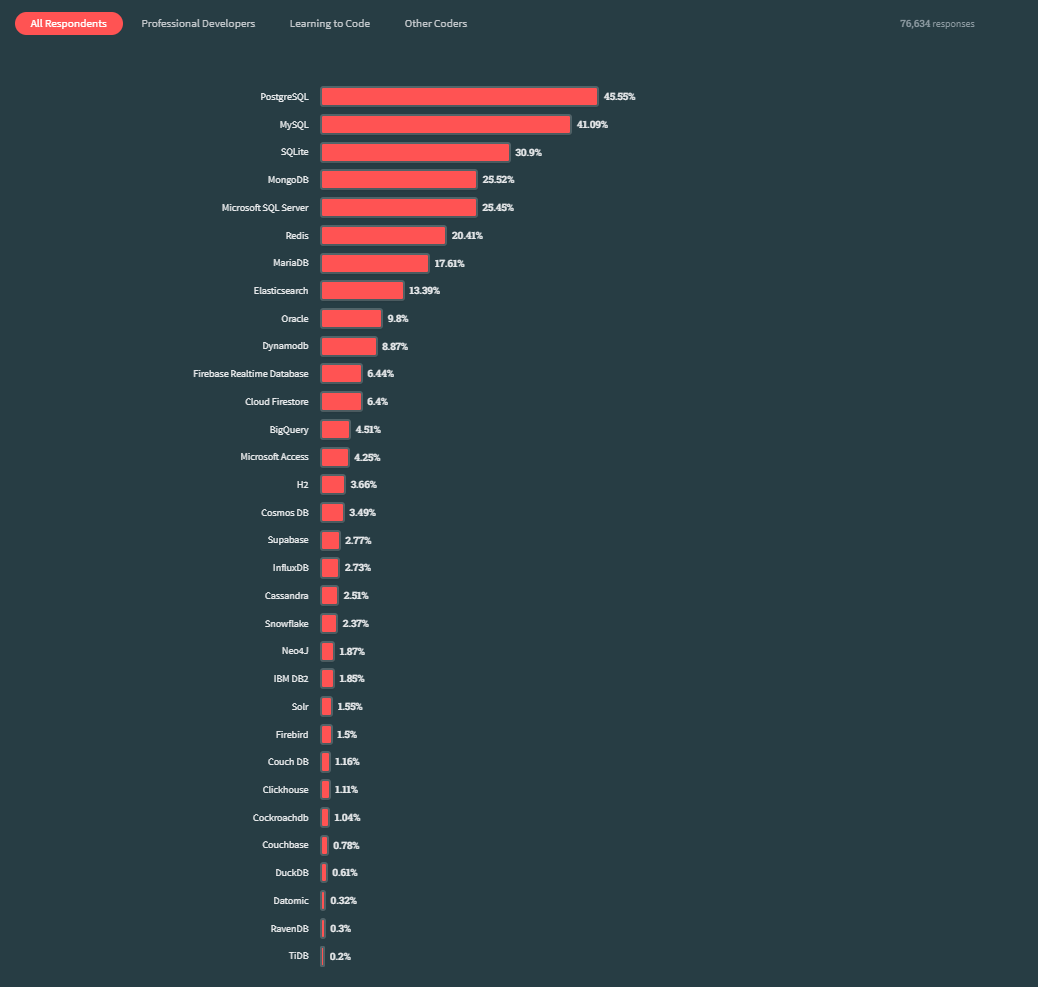 在最喜爱的数据库调研中,有45.55%的开发者正在使用PostgreSQL,首次超越MySQL,这使得PostgreSQL登上数据库流行度的榜首。MySQL退居第二,有41.09%的开发者正在使用MySQL。其次是SQLite(占比30.9%)。Oracle位列第九,占比9.8%。中国的 TiDB 榜上有名。