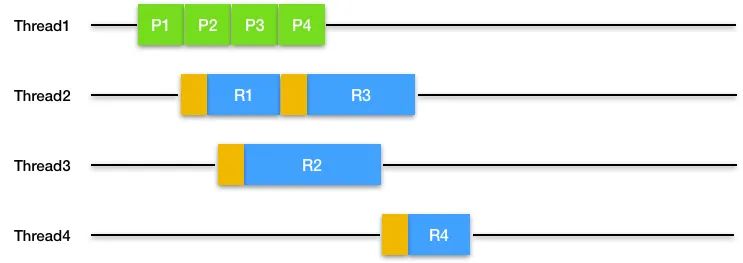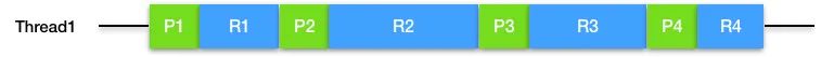 图中,绿色代表生产一个任务,蓝色代表执行这个任务,下同。