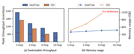 在多个 hop 的遍历场景下,GeaFlow 整个的内存保持平稳,并不会随着迭代深度增加而显著增加,而其他通用流式计算引擎,则会有显著的存储空间放大,从而在 hop 数过多是内存溢出。