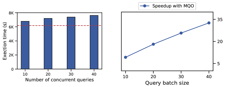 在图4中我们看到随着批次中并发的查询数据量增大,执行时间增加的并不会特别明显。可以发现融合40个query的时间只增加了22.7%,达到32.6倍的提速效果。
