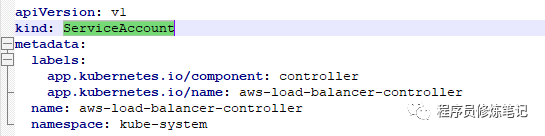 4. 在kube-system的namespace下创建一个SA,SA的名称是aws-load-balancer-controller,SA的YAML文件定义如下: