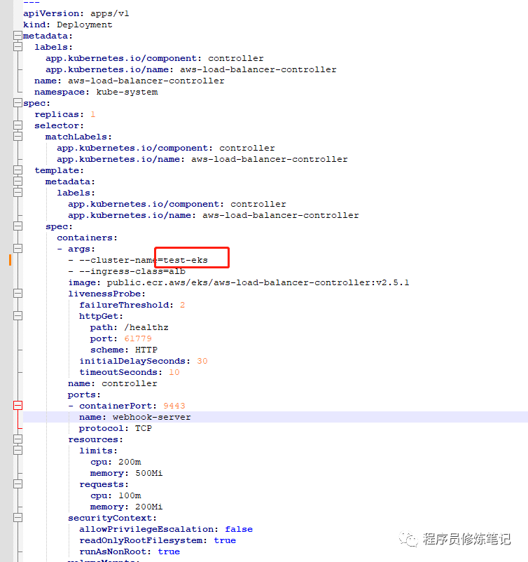 其次我们需要修改Deployment中cluster-name变成我们的ESK集群名称,我的集群名称是test-eks,所以修改后的信息如下图: