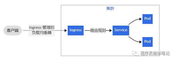 通过ingress让集群外的服务访问我们集群内的服务,通过上图可以看出大约需要4个组件