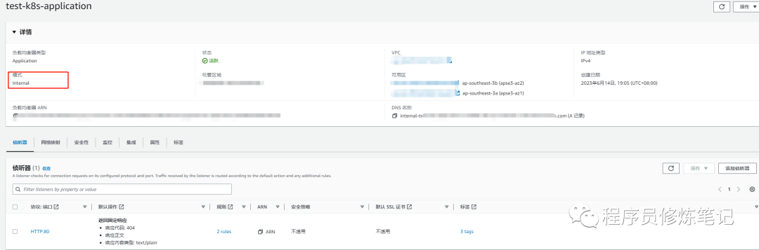 上述资源清单文件安装完成以后,会在AWS负载均衡器上创建一个alb,如下图: