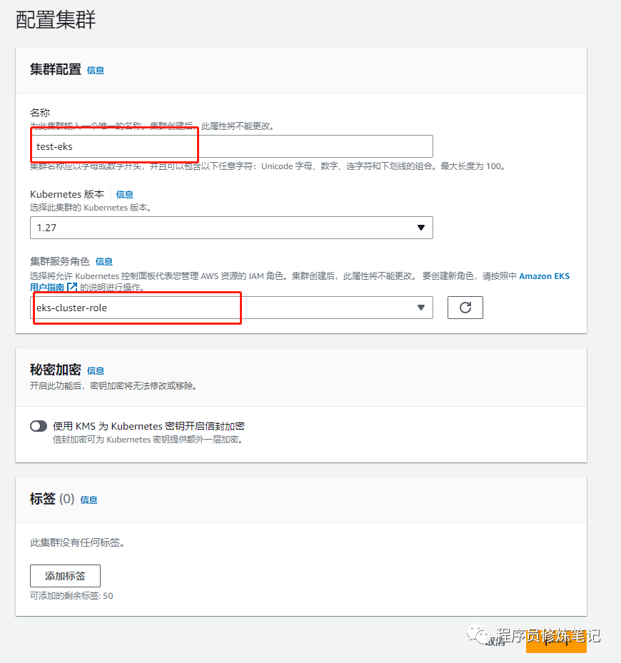 6. 最后下一步确认信息创建就可以,最后我们可以在EKS的控制台上看到我们创建的集群