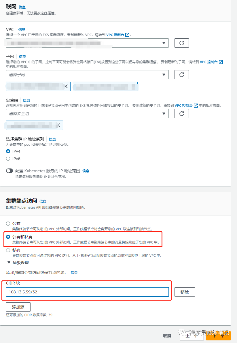 2. 配置网络环境,vpc、子网、安全组选择我们上面的步骤创建的,集群端点访问选择公有和私有,如果集群端点访问你选择了包含公网的暴露方式,请指定一下CIDR块,这里相当于公网的IP白名单(假设你想让108.13.5.59的公网地址访问你的集群,这里就配置108.13.5.59/32)。