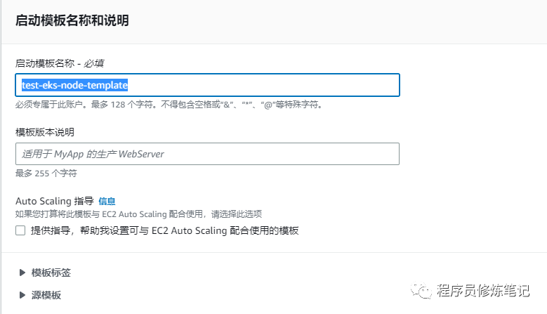 指定启动模板名称,test-eks-node-template,如下图: