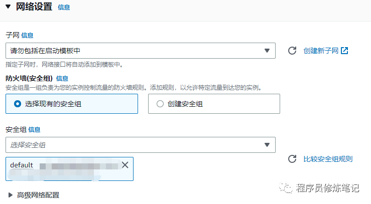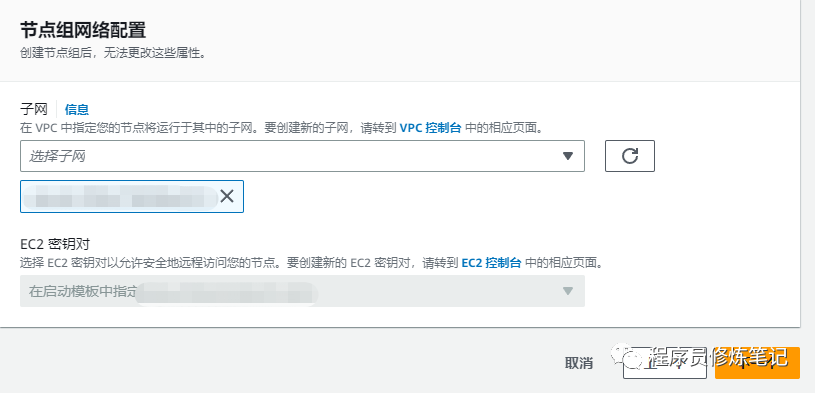 5. 指定网络设置,这里主要用来指定子网和安全组,子网我们可以不设置,安全组在设置的时候一定要选择集群在的vpc的安全组
