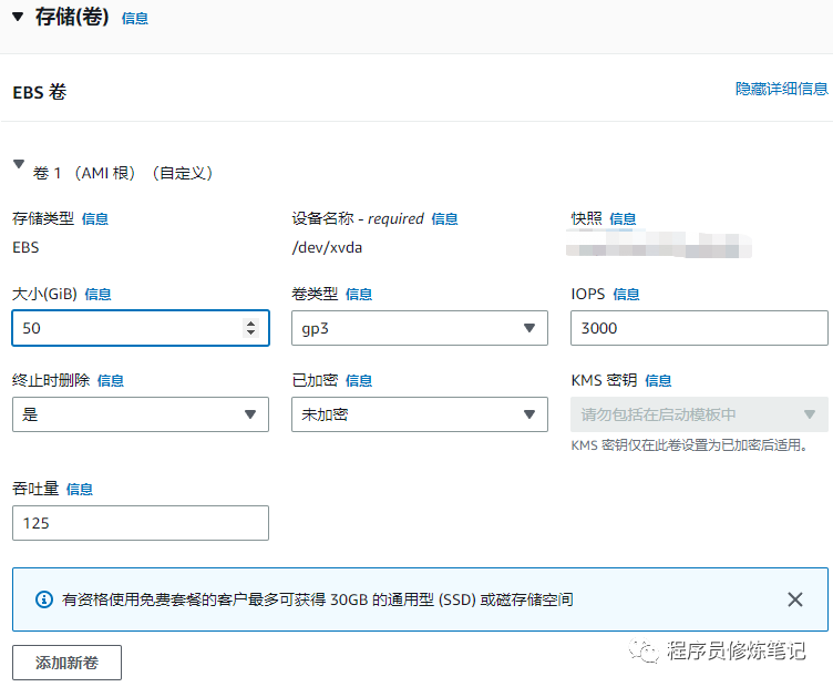 6. 指定存储,我这里卷类型指定为gp3,大小给50GB,如下图: