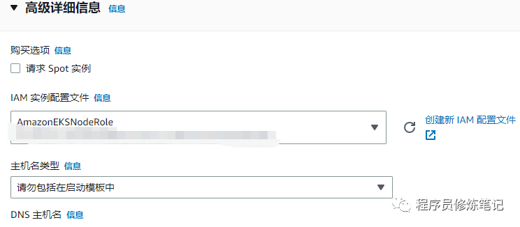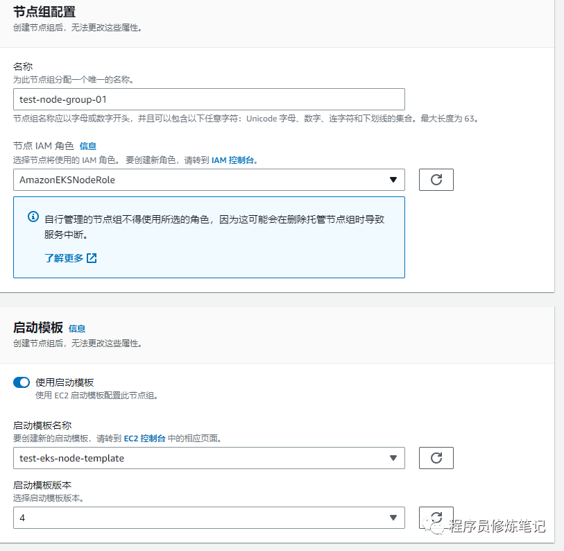配置节点组,这里主要指定节点组的名称,IAM的角色,然后指定启动模板,如下图: