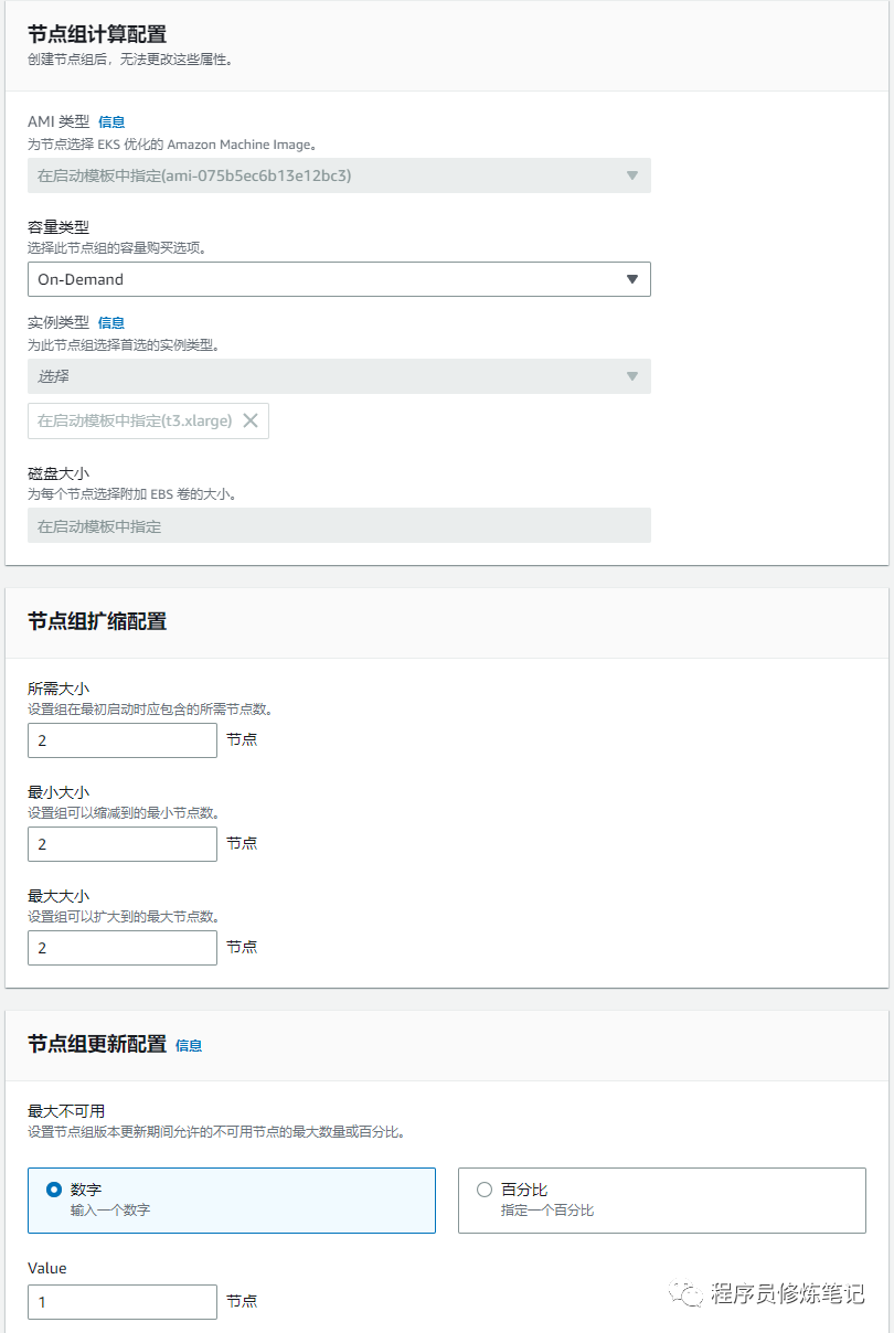 2. 节点组配置,这里主要指定节点组里面节点的数量大小,实例类型等参数,如下图: