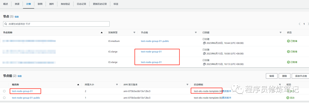 4. 最后一步就是确认信息进行创建了,创建成功以后我们可以eks的计算下面看到我们新建的节点组和节点如下图:
