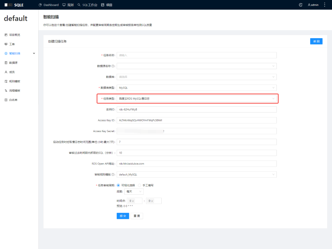 2. 在扫描任务列表页面,用户点击创建扫描任务,选择 MySQL 数据库类型,选择任务类型为百度云 RDS MySQL 慢日志,填写相关信息后,点击提交,完成扫描任务创建。