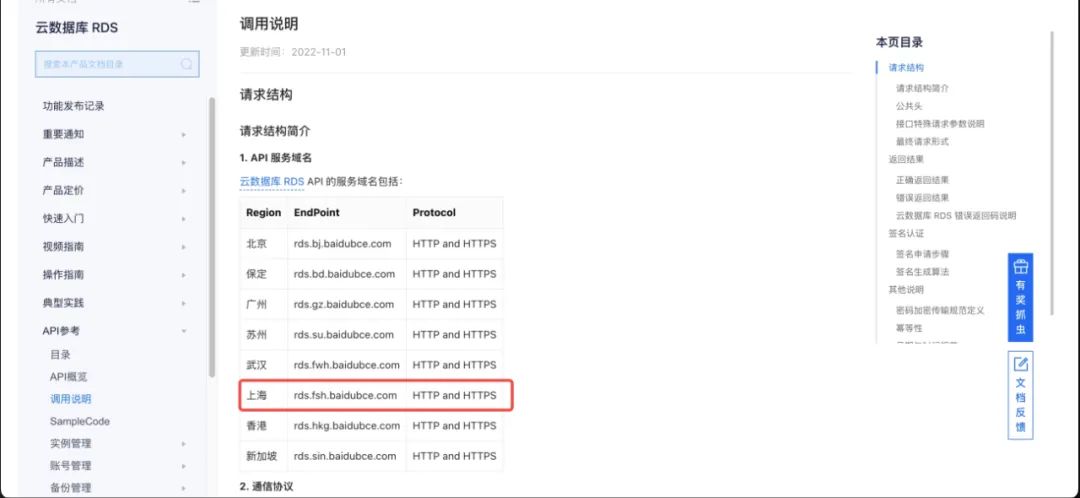 RDS Open API 地址:RDS 的地址前缀,用以调用 RDS 服务,需根据实例所在区域进行填写。如当前实例在华东-上海范围,则应填写 rds.fsh.baidubce.com