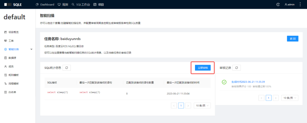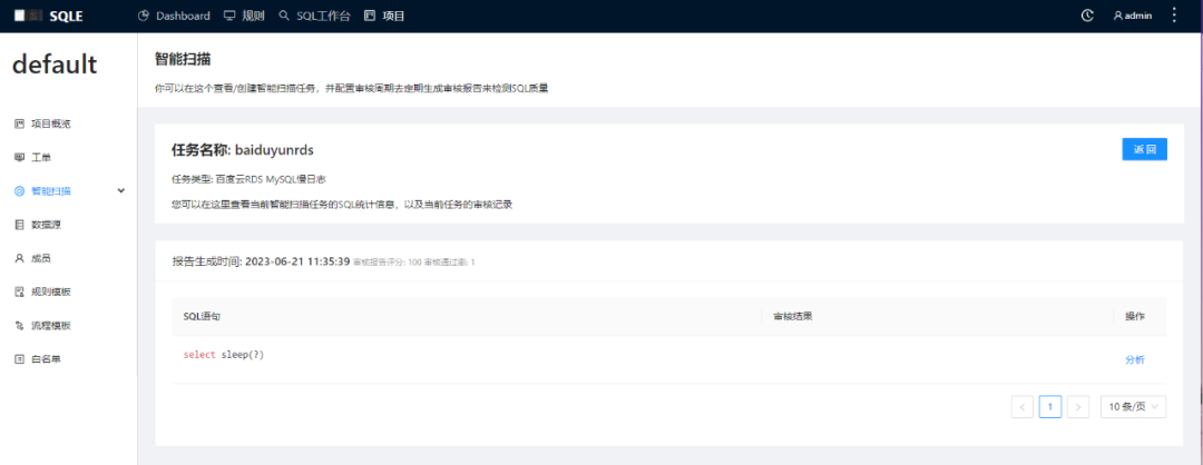 本期新增百度云 RDS MySQL 慢日志智能扫描任务,配置后,SQLE 可以对百度云 RDS 实例上的慢 SQL 进行监管。通过 SQLE 平台给出的审核结果,用户可以有针对性地优化数据库性能。以下是简单的功能试用: