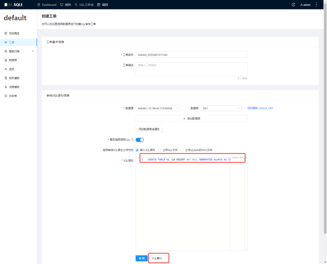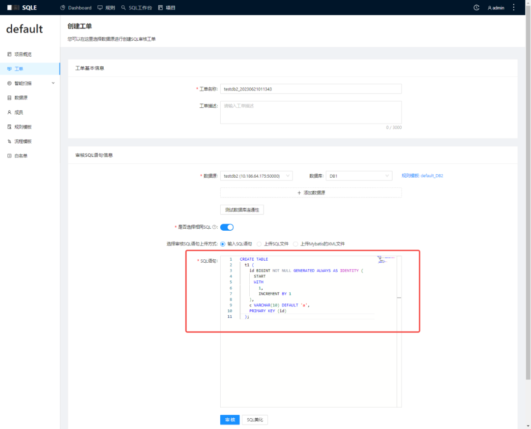例如,如果用户在工单中输入了两条 SQL:创建一张新表 T11,并向其中插入一个新字段。在审核第二句 SQL 时,平台将模拟执行建表语句,并根据上下文给出相应的审核意见。因此,即使实际数据库中不存在表 T11,第二条 SQL 的审核结果也不会触发表不存在的告警。