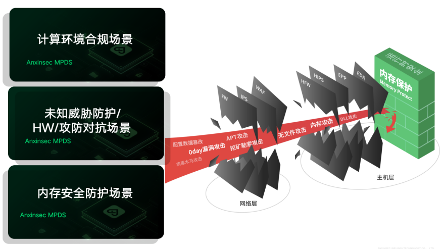 难发现、难检测、难处理!内存攻击(ROP、堆栈属性攻击、缓冲区溢出、内存代码片段、傀儡进程等)、无文件攻击、0day漏洞利用等新型攻击方式,可以轻松绕过传统的安全检测机制,给现有的安全防护体系带来较大的安全挑战。