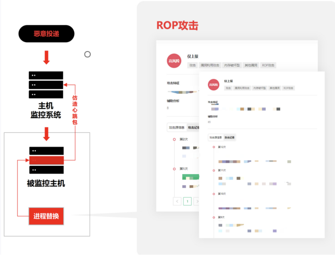 在某部委内存安全防护系统建设项目中,通过采用本方案建设内存安全防护体系,提升主动防御能力,增加业务系统服务器安全性,为现有的安全防护措施提供了有效补充。在攻防测试期间,恶意样本下发至被监控主机进行ROP内存攻击时,成功触发内存防护机制,并实时拦截攻击行为,上报安全事件。