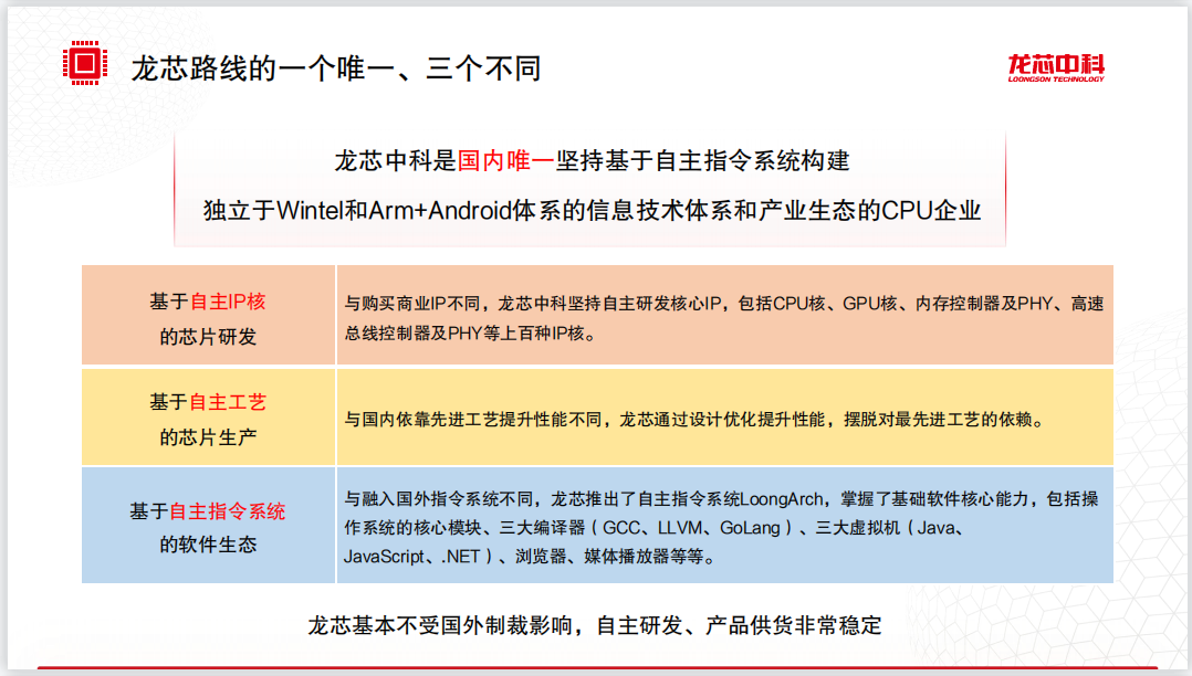同时,郭同彬表示,我国自主的CPU及自主生态发展已取得了一定成果,以龙芯CPU为例,其芯片性能在国内同类产品中已处于领先水平,且已原生支持Linux全部主流应用开发环境。