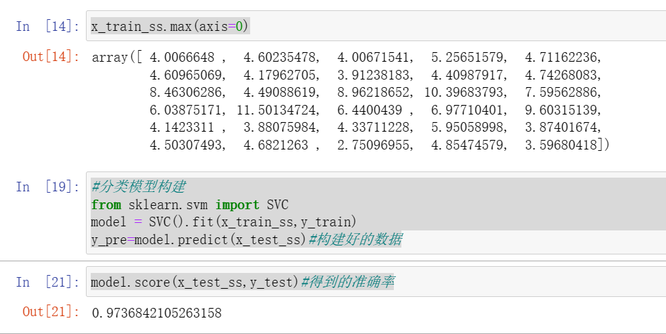 from sklearn.model_selection import train_test_split#划分训练集、测试集x_train,x_test,y_train,y_test=train_test_split(x,y,test_size=0.2)#测试集占总比例的百分之20#模型预处理x_train.shapex_train.max()#查看最大值import numpy as npnp.int32(x_train.max(axis=0))#每一列的最大值x_train.min()from sklearn.preprocessing import StandardScaler#预处理model = StandardScaler().fit(x_train)x_train_ss=model.transform(x_train)x_test_ss=model.transform(x_test)x_train_ss.max(axis=0)#分类模型构建from sklearn.svm import SVCmodel = SVC().fit(x_train_ss,y_train)y_pre=model.predict(x_test_ss)#构建好的数据